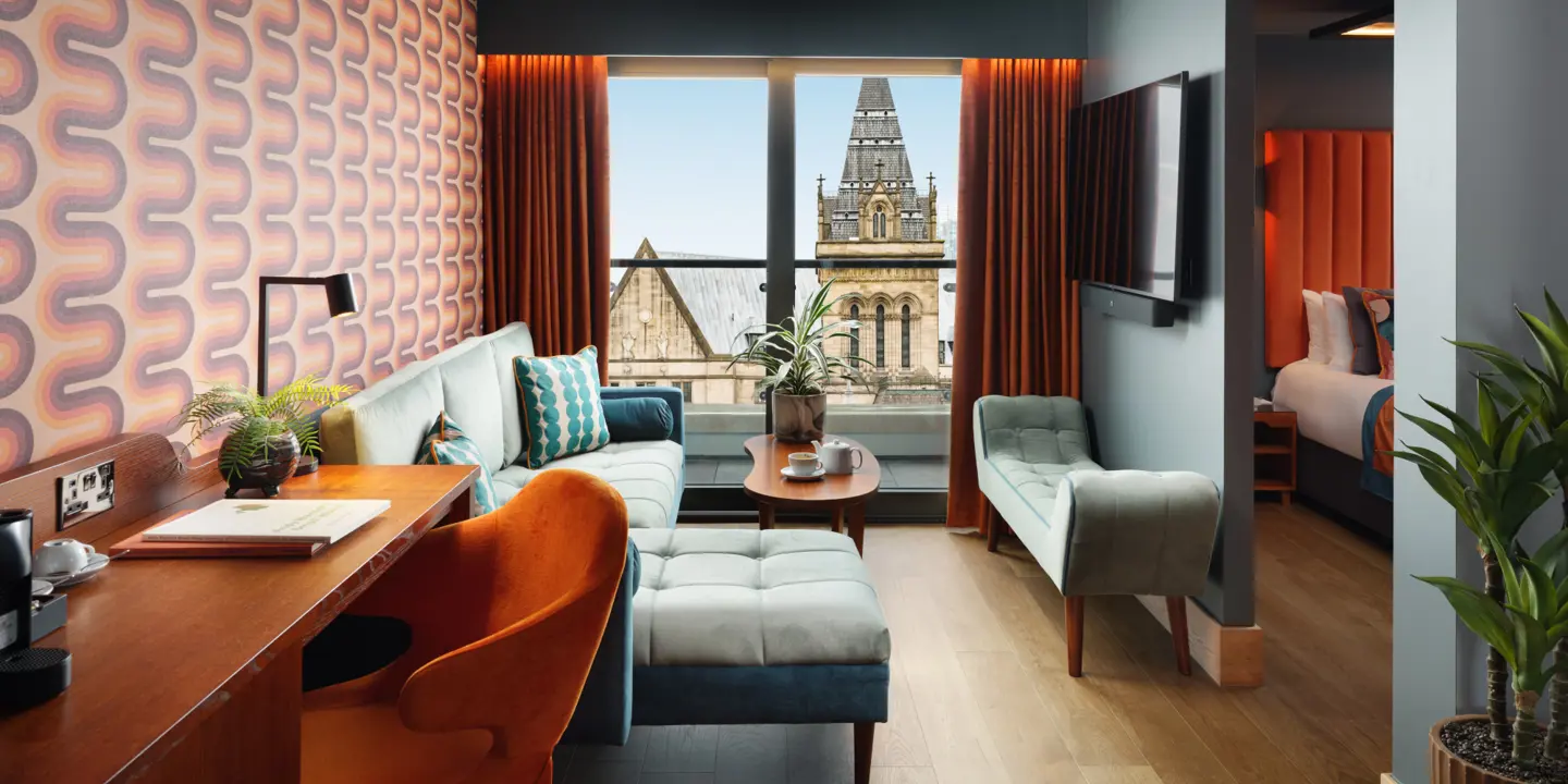 Its guestrooms pay homage to the retro design of the 60s and 70s, referencing the iconic G Plan furniture of this era, a benchmark for classic British design. Each room talks to the exterior of the building design, complimenting the harsh, brutalist designs of the exterior with bold patterns, powerful colours, strong materiality and striking artwork.