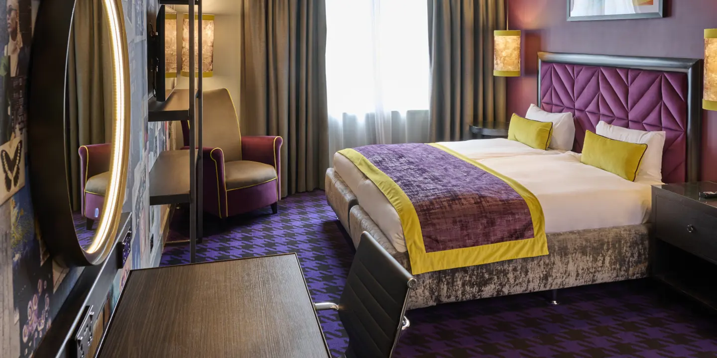 Stylish standard room with twin beds, en-suite with bath and shower. Two's company even if it's purely platonic or strictly corporate.