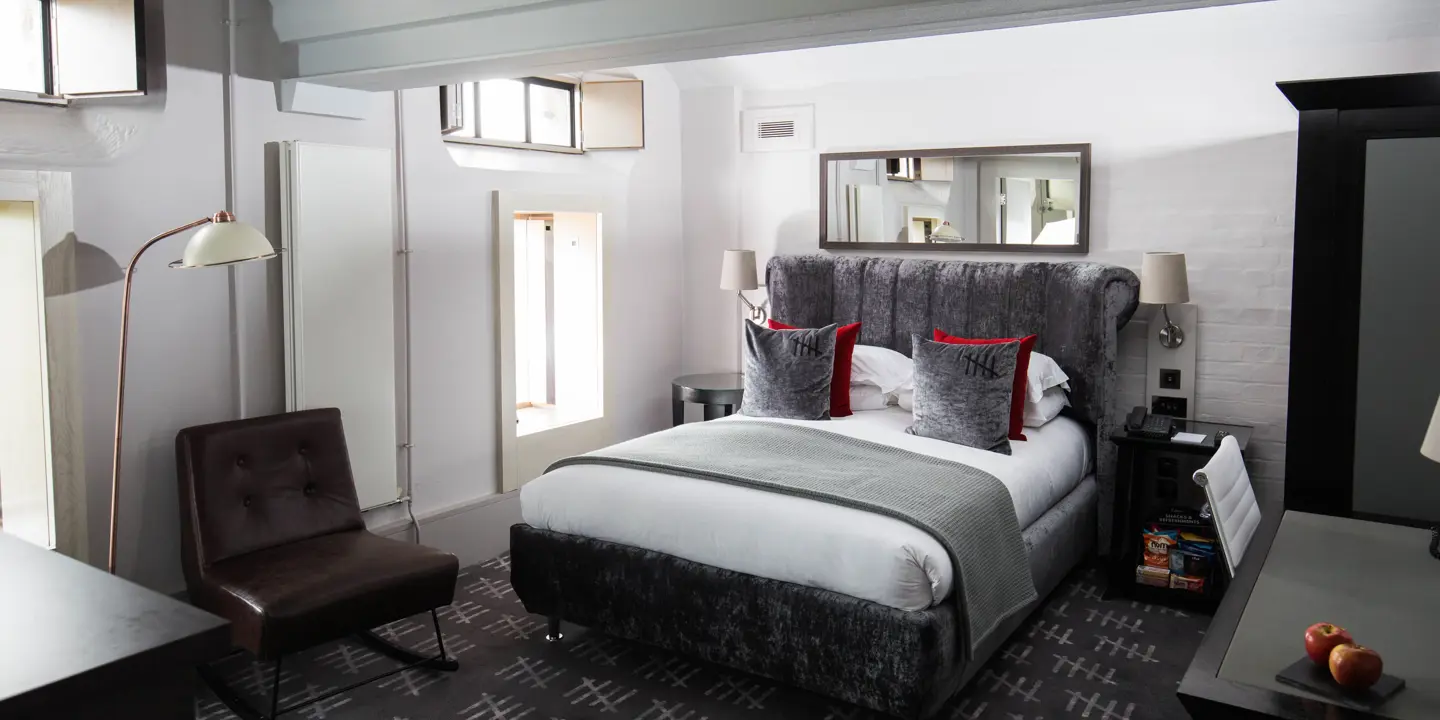 Spacious club double cell room in the A-Wing. Complete with double bed, en-suite bathroom with roll-top bath and walk-in shower.